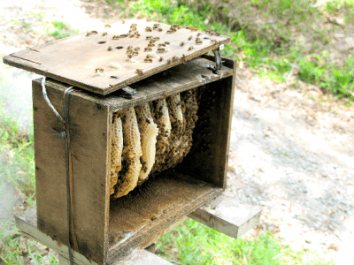 ガイドが持っている煙は、ココナッツの煙で、ミツバチに刺されないように、ヤシの葉を燃やした煙を出しながら巣箱まで歩いていきます。巣箱は道沿いに並んでいて、その1つを開けると無数のミツバチが飛び出てきて、ブンブン飛びまわります。手のひらで払おうとすると刺されるので、静かに観察しましょう。収穫の時期でないときは、ここで終了です。